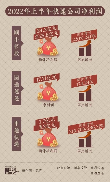 各大快遞公司也陸續(xù)發(fā)布上半年業(yè)績(jī)報(bào)告,顯示出市場(chǎng)整體回暖向好態(tài)勢(shì)。其中順豐控股(50.190, 0.40, 0.80%)實(shí)現(xiàn)凈利潤(rùn)預(yù)計(jì)在24.3億元至25.8億元,同比增長(zhǎng)220%至240%;圓通上半年實(shí)現(xiàn)凈利潤(rùn)17.71億元,同比增長(zhǎng)174.24%;申通也終于扭虧為盈,預(yù)計(jì)實(shí)現(xiàn)凈利潤(rùn)1.7億元至2億元,同比增長(zhǎng)216.20%至236.71%。