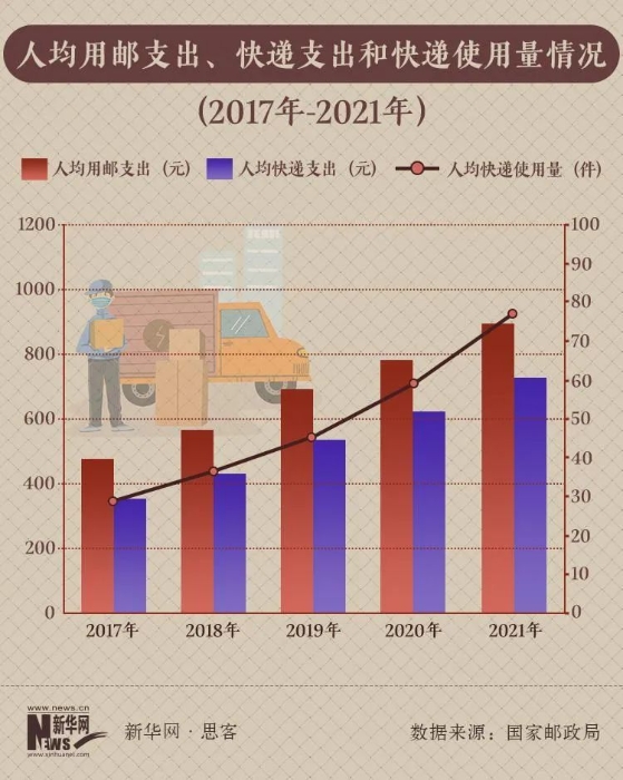 據(jù)國(guó)家郵政局?jǐn)?shù)據(jù)顯示,2017-2021年人均用郵支出、快遞支出和快遞使用量每年都在增長(zhǎng),其中2021年人均快遞使用量為76.7件,年人均用郵支出895.0元,年人均快遞支出731.4元。按照第七次全國(guó)人口普查結(jié)果14.12億人推測(cè),2021年平均每人每月快遞量超過(guò)6個(gè)。