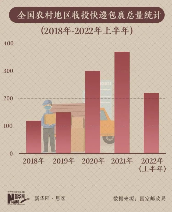 從上圖可以看出,2018年-2021年,全國(guó)農(nóng)村地區(qū)快遞包裹收投總量在逐年上升,由2018年的120億件上升到2021年的370億件。龐大的快遞包裹數(shù)據(jù)背后,是加速推進(jìn)的“快遞進(jìn)村”步伐和不斷增強(qiáng)的農(nóng)村經(jīng)濟(jì)活力,也讓人看到了農(nóng)村消費(fèi)市場(chǎng)蘊(yùn)藏的巨大潛力。