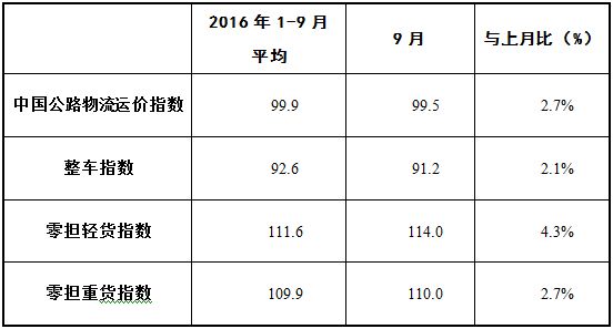 中國公路物流運價指數(shù)2016年9月為99.5點,比上月回升2.7%。本月運價指數(shù)環(huán)比回升,一方面是受到公路物流市場逐漸步入傳統(tǒng)旺季,需求回升所致;另一方面,受到治超新政實施等因素影響,運輸費用有所上漲,帶動價格指數(shù)回升。從各周情況看,月內(nèi)除第三周小幅回調(diào)外,其它各周均呈現(xiàn)“加快回升”的走勢。