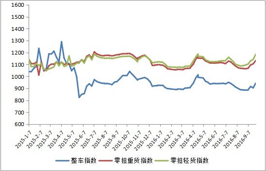 從分車型指數(shù)看,各車型指數(shù)比上月均有所回升。其中,以大宗商品及區(qū)域運輸為主的整車指數(shù)比上月回升2.1%,為91.2點。與此同時,食品、日用品等消費需求穩(wěn)步增長,電子商務(wù)等網(wǎng)上零售消費需求高速增長,帶動零擔物流需求較上月顯著回升。零擔指數(shù)中,零擔輕貨指數(shù)為114.0點,比上月回升4.3%,但比上年同期下降1.8%;零擔重貨指數(shù)為110.0點,比上月回升2.7%,但比上年同期下降7.0%。